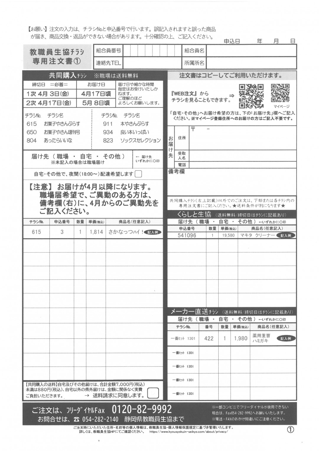 注意2:直送企画・くらしと生協のご注文も下記「商品専用注文フォーム」でご入力をお願いします。チラシ№欄に『チラシ№』または、『チラシ名』をご入力ください。