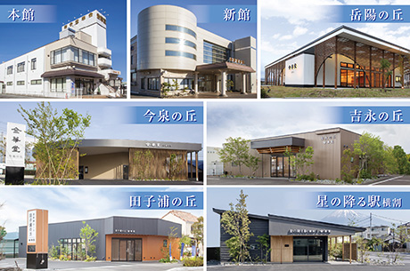 | 式場 | 新館・本館(本社):静岡県富士市松岡531-5 岳陽の丘:静岡県富士市伝法744-1 今泉の丘:静岡県富士市今泉2015-1 吉永の丘:静岡県富士市富士岡452-1 田子浦の丘:静岡県富士市川成新町418 星の降る駅:静岡県富士市横割6丁目8-18 |